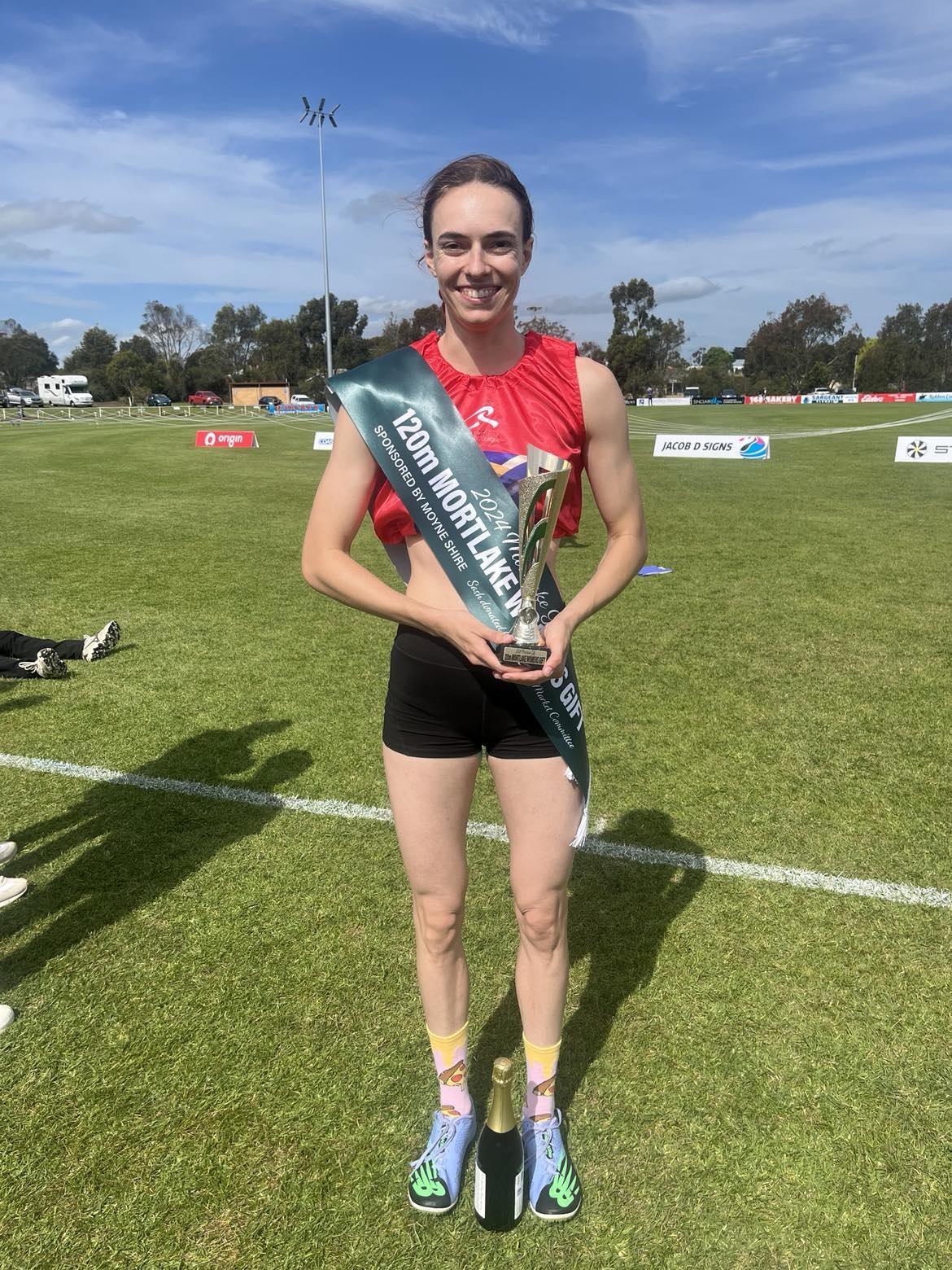 Kayla’s 2024-25 season started with a regional competition in September before she transitioned back into the professional ranks. Her biggest moment came at the Mortlake Gift, where she claimed victory and secured a crucial lift for Stawell. “Winning Mortlake wasn’t exactly planned, but it was a huge relief,” she says. “It gave me a chance to focus on building speed and endurance leading into Easter. And getting myself a pretty sash to display at home had been a 2024 goal!”