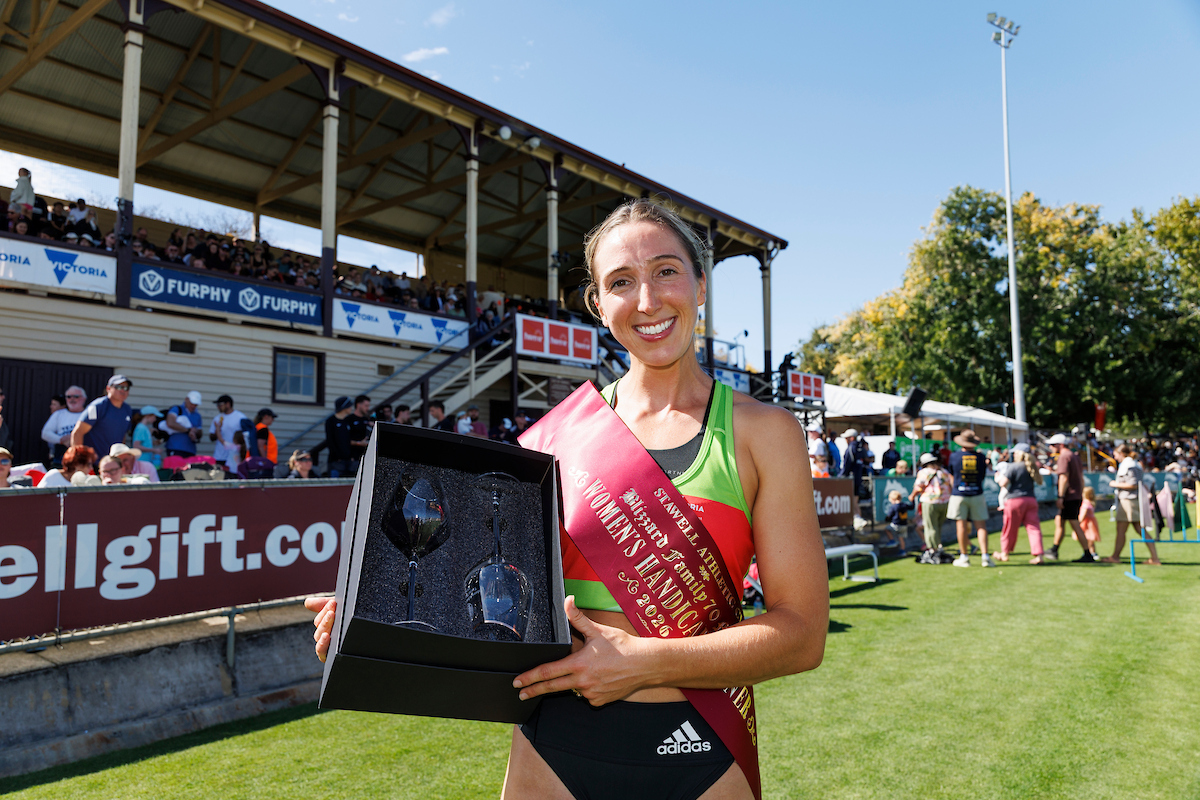 Tara Beasley wins the Change Our Game Womens’ Handicap – 70m during day 2 of the 2026 Powercor Stawell Gift. 5th April, 2026. Photo by Luke Hemer/Stawell Gift.